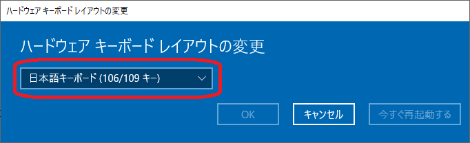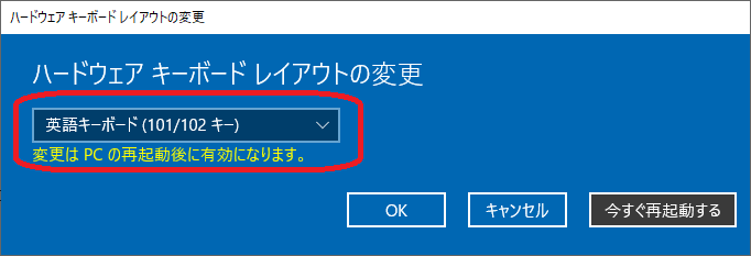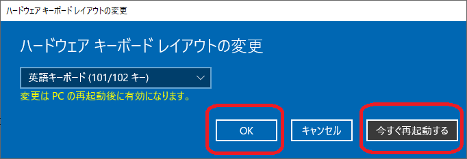 - >「OK」または「今すぐ再起動する」を選択する。再起動後にキーボードの変更が有効になる。